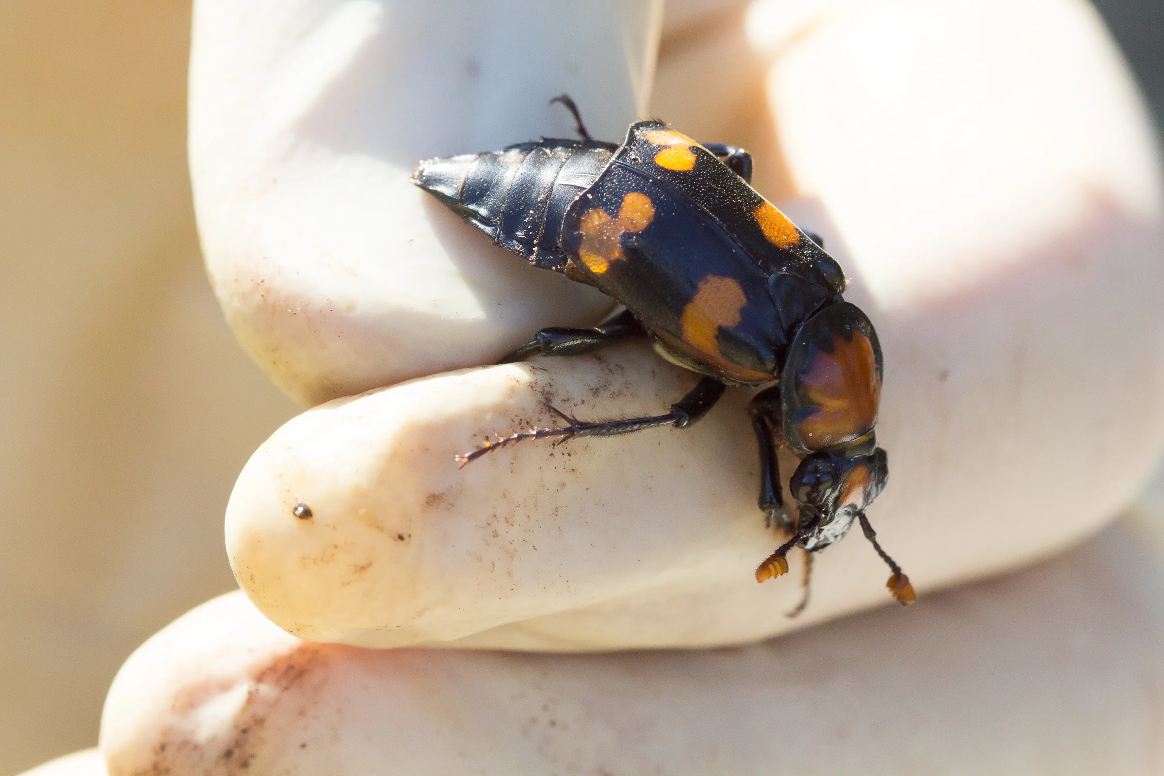 Ben has been working with the federally endangered American Burying Beetle, a carrion beetle whose range once covered most of the eastern half of the United States. However, by the 1920s the beetle was extirpated in most of those states. There's no simple explanation to the beetle's decline. It's likely that a number of interconnected factors are to blame. The beetle prefers carrion that weighs between 100 and 200 grams. Some suitable species populations slowly decreased or became extinct, such as the Passenger Pigeon. An increase in agricultural land and its subsequent edge habitat creation did increase mice populations, but they're too small for the beetle. Edge habitat is utilized by carrion eaters and predators, such as crows, foxes, raccoons, and skunks, all of which compete with the beetle for carrion (NYS DEC).
