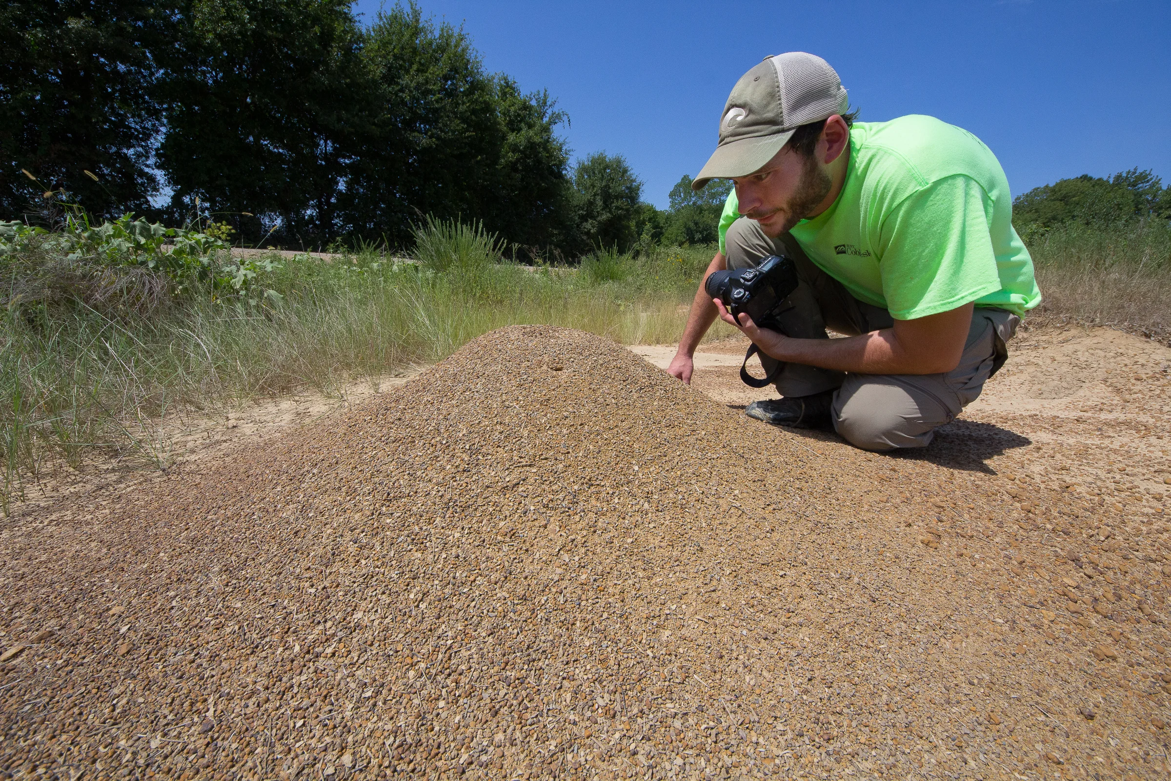 Ben showed me a sizable mound of the Harvester Ant species Pogonomyrmex barbatus. These large seed harvesters measure between 8 and 10mm in length and have a notoriously painful sting. We found this mound and one other at the edge of a soybean field.