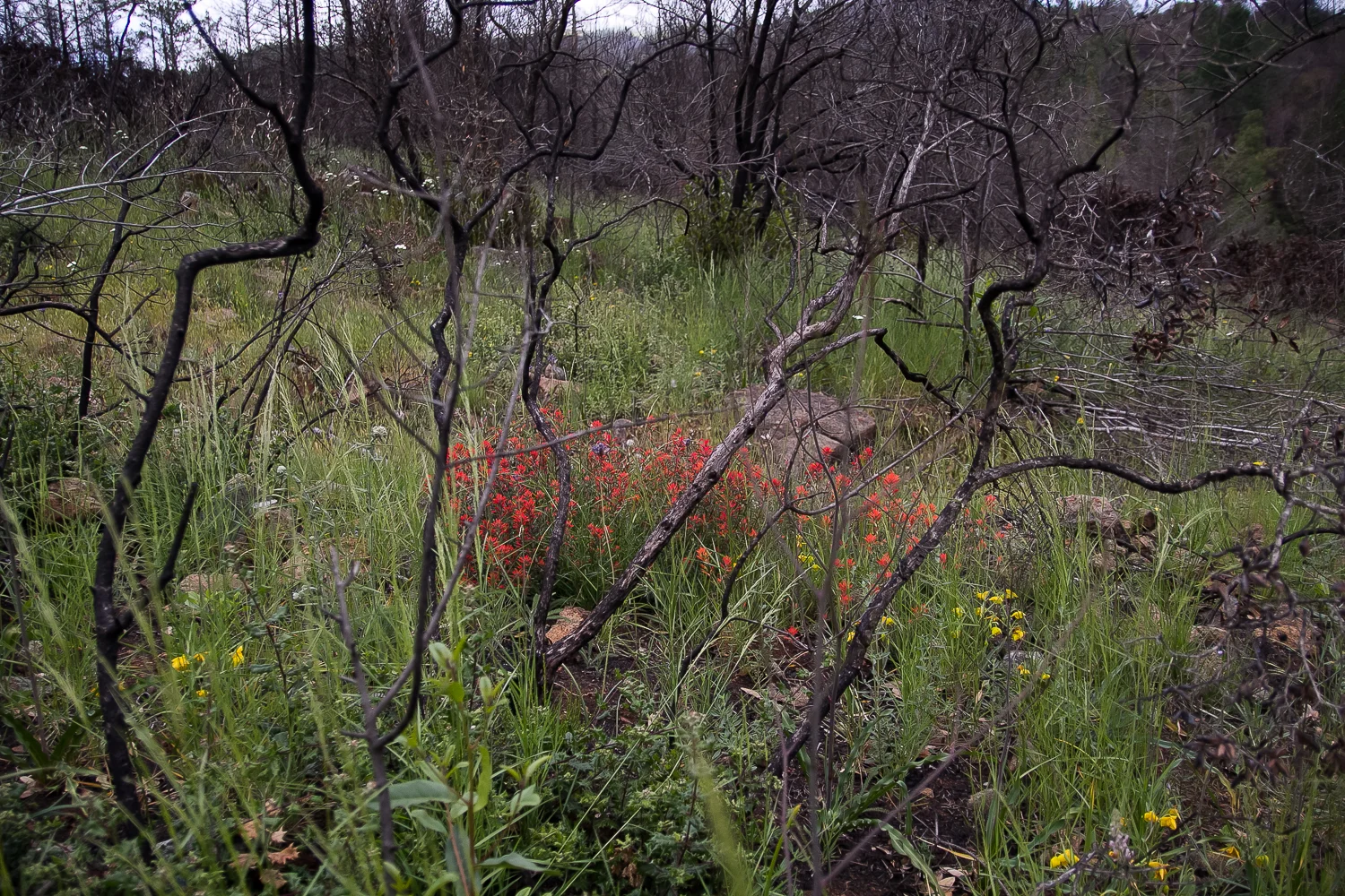 Fires wipe out and hinder woody vegetation, but herbaceous (non-woody) species can rebound quickly. Many plants have viable seeds stored in the soil for years, waiting for disturbance. Fire reduces crowding, allows for more sunlight, and provides fresh nutrients. The result can be bigger-than-usual blooms of both familiar and rare plants.